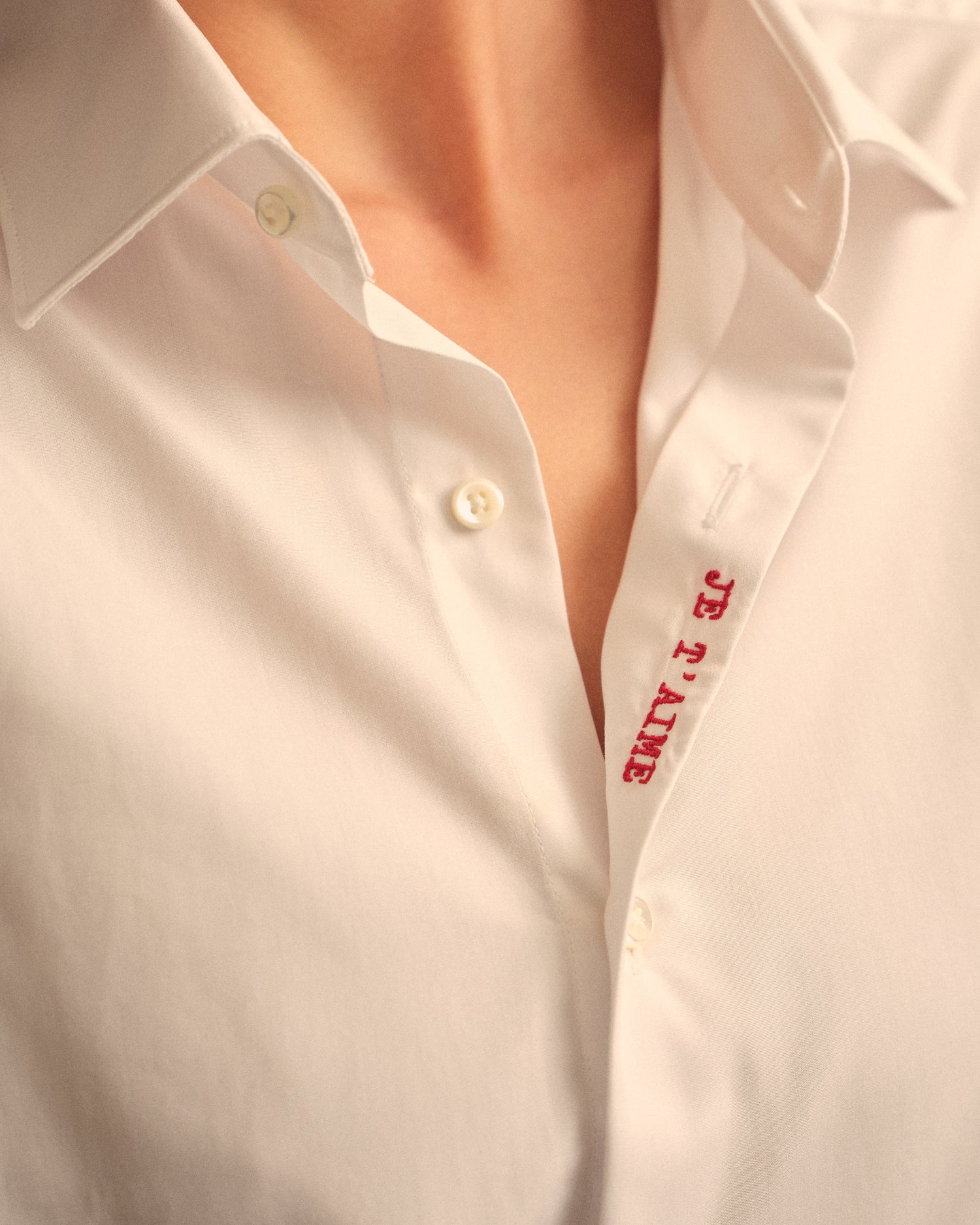 Inspired by culture, cinema, and a love of words, she imagined a unisex shirt with discreet embroidery, placed on the inside of the button placket, close to the heart. A statement shirt, but in a whisper.