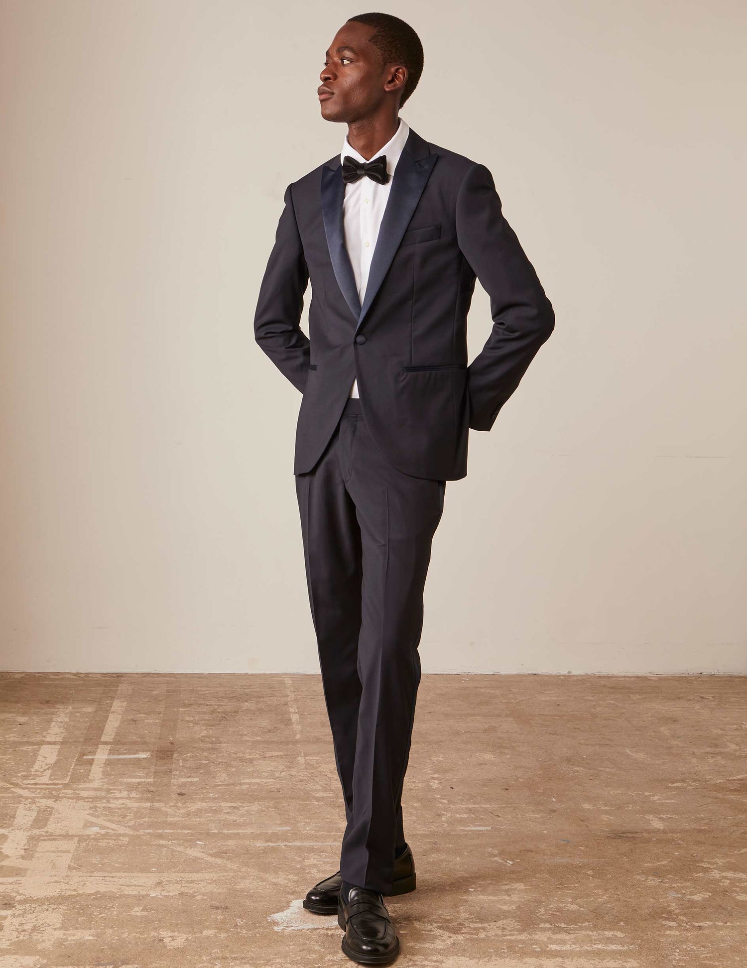The versatile navy virgin wool suit can be paired with a thin tie or a pocket square, making it suitable for both formal and more casual weddings. Its durability also makes it an ideal choice for various personal or professional occasions.
