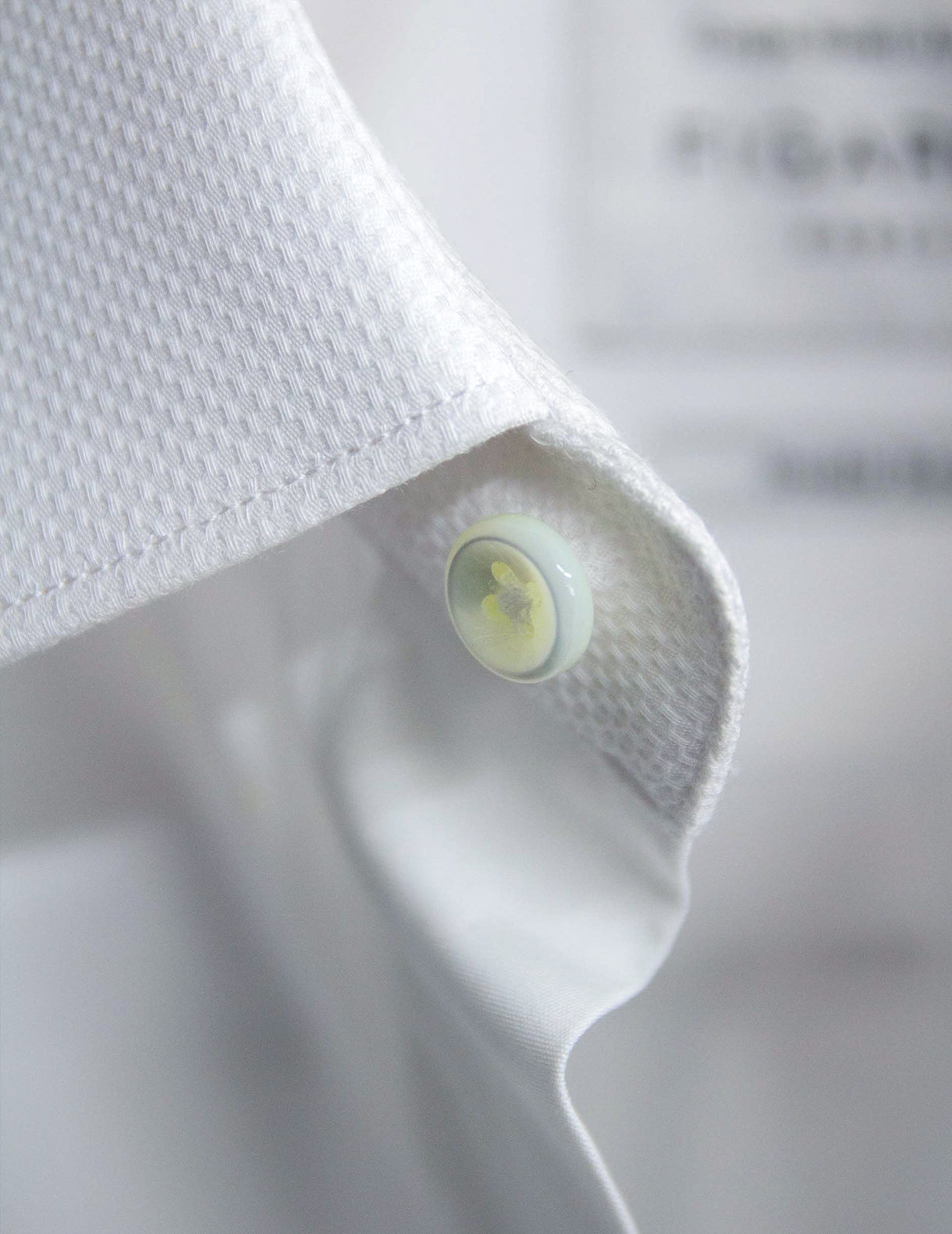 Signature formelle Figaret, le bouton au pied de col se distingue par une couture dissimulée. Fixé avant l’assemblage du col au corps, ce montage spécifique inverse l’ordre industriel classique et témoigne d’un véritable savoir-faire.