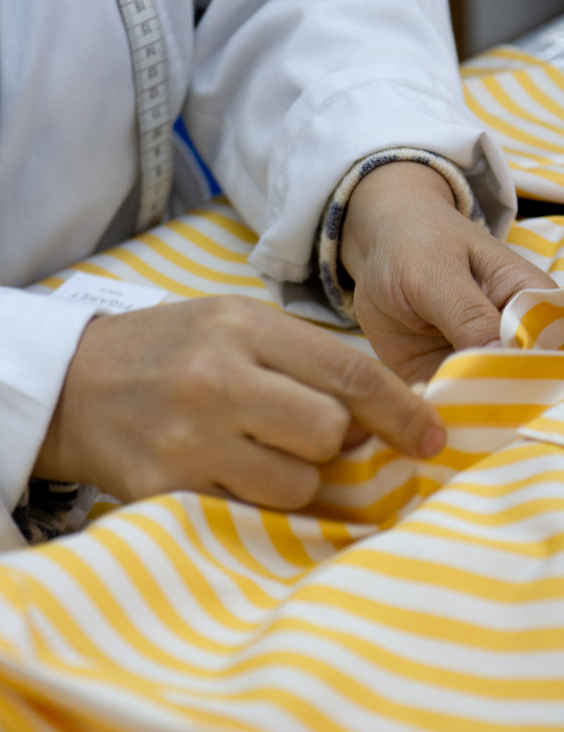 The matching stripes are the result of precise craftsmanship: on a needle table, each piece of striped fabric is adjusted millimeter by millimeter to create perfect continuity and achieve an impeccable finish.