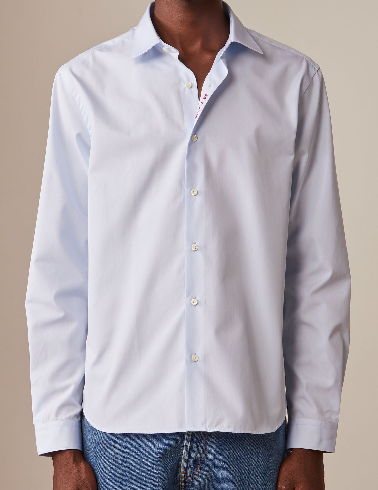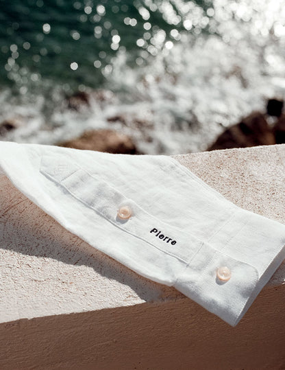 "Je t'aime" shirt freely inspired by Claude Sautet's film "Les Choses de la vie". The mixed shirt: a man's shirt that's never worn as well as by a woman. A message, a declaration of love addressed to the other person or to yourself: "Je t'aime" is subtly embroidered on the reverse of the button placket, not far from the heart.