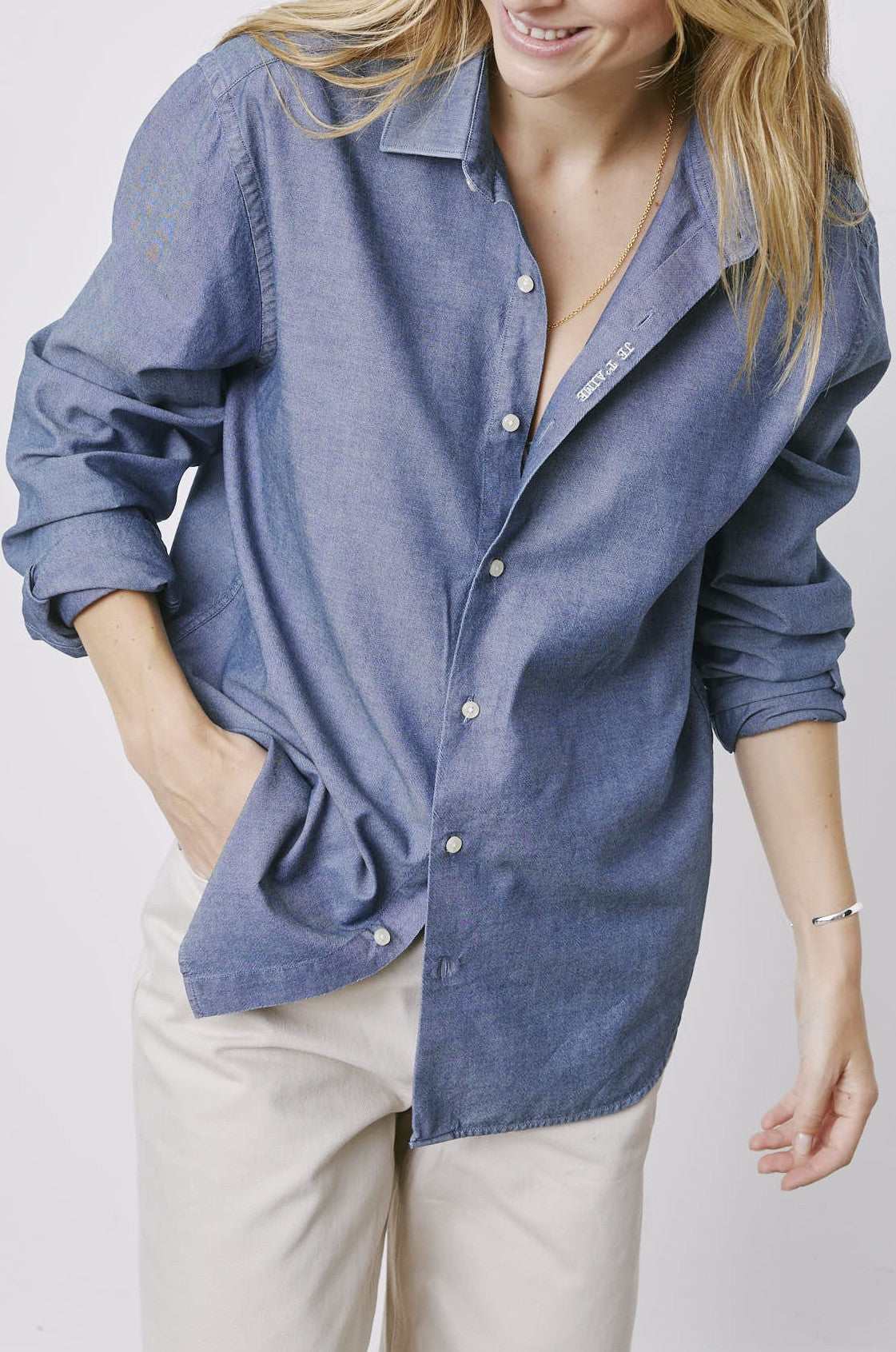 This shirt is a "men's shirt" designed with our semi-fitted cut. The fit is oversized when worn by a woman.