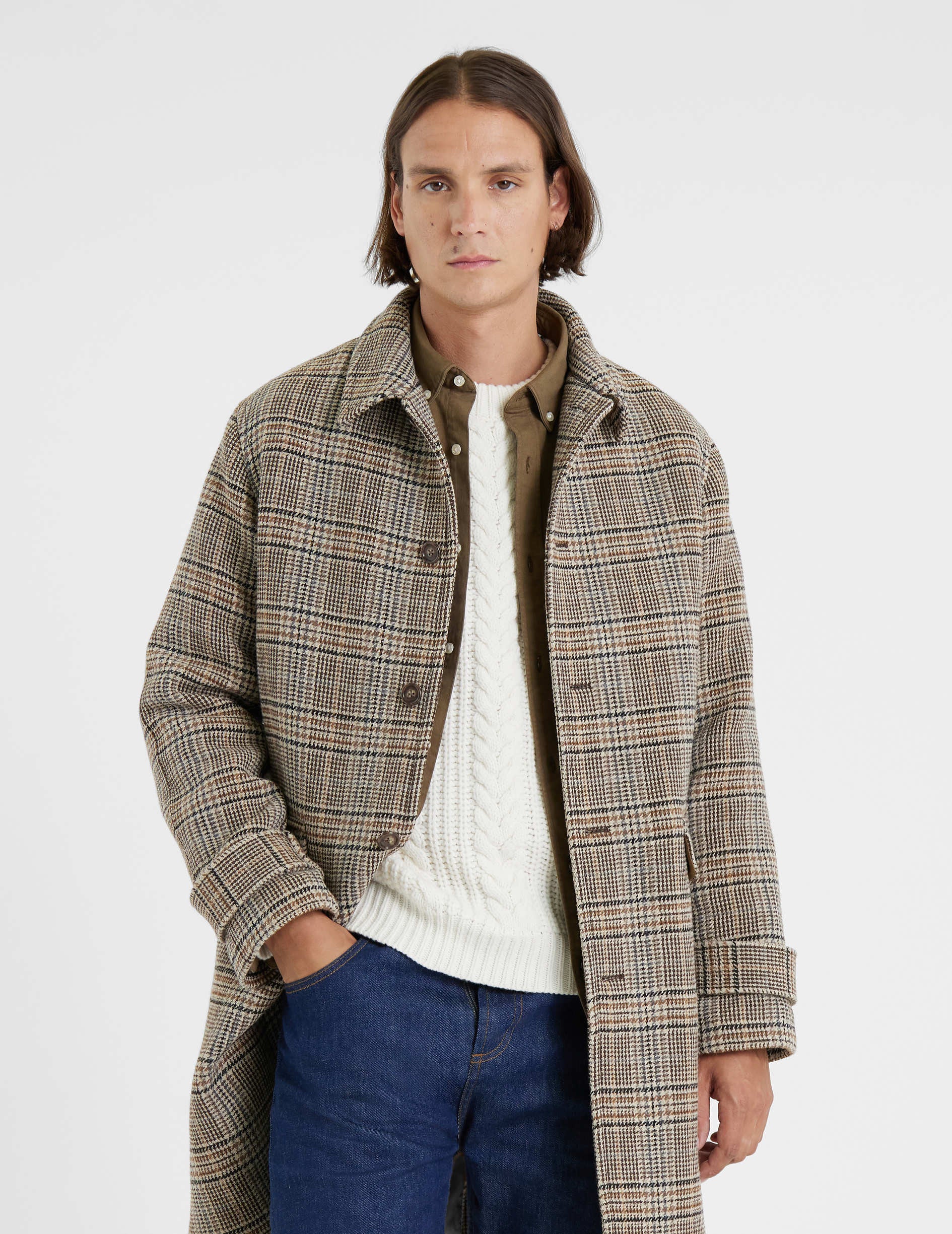 The Emilio coat in Prince of Wales wool cloth has faux horn buttons and flap pockets which give it a distinguished look. Mid-length with a slit at the back, it has great style.