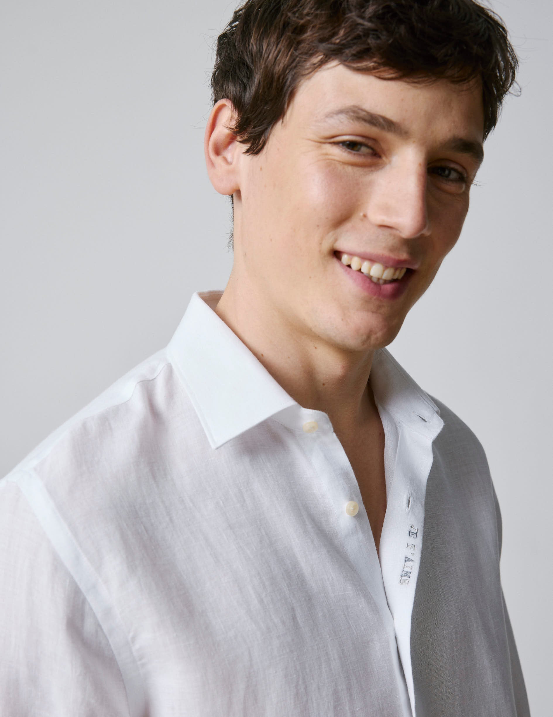 Unisex White linen "Je t'aime" shirt Linen - Figaret Collar